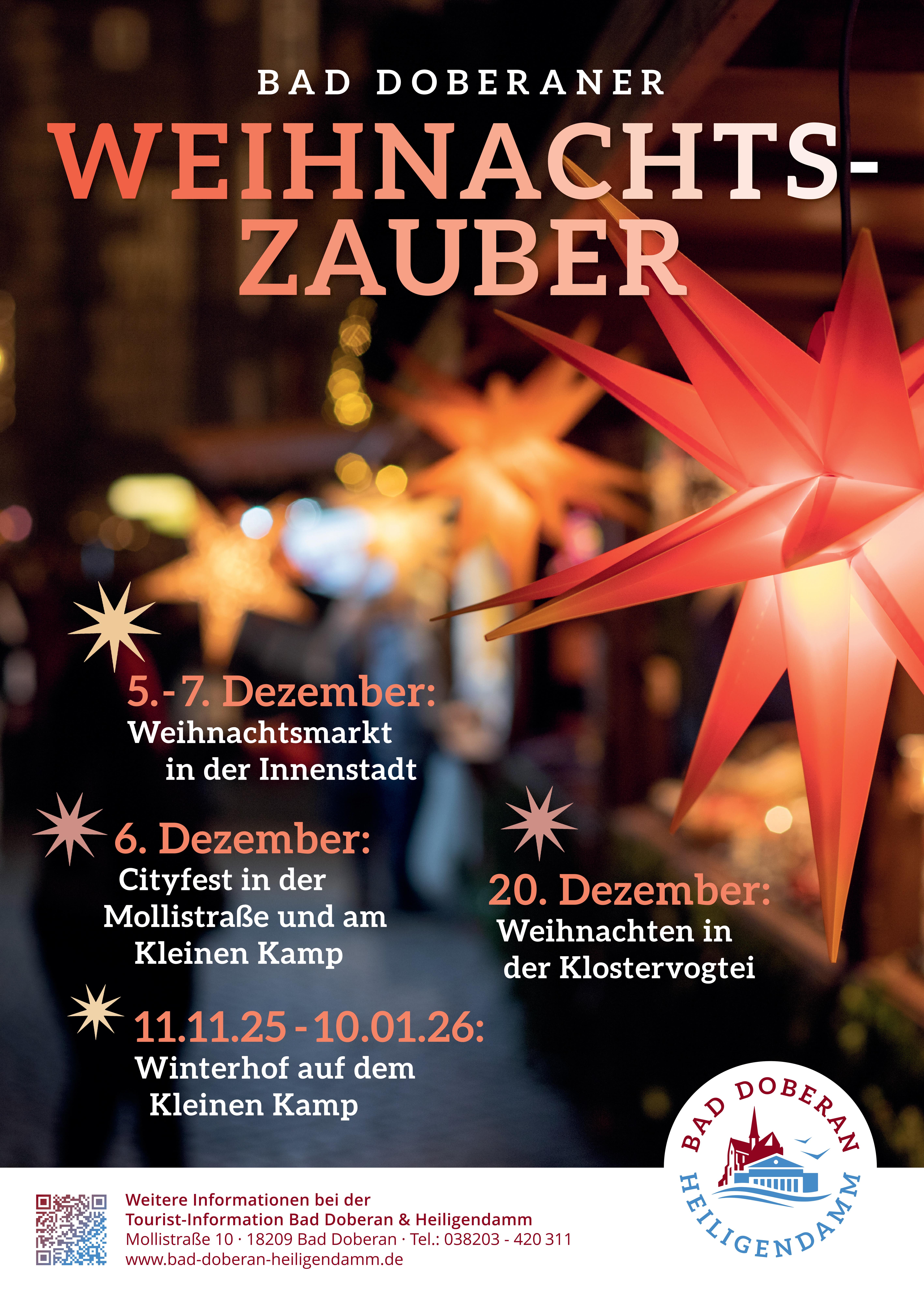 Weihnachtsmarkt Das weihnachtliche Markttreiben kommt nach Bad Doberan mit vielen Ständen, Händlern, Live-Musik und einem abwechslungsreichen Bühnenprogramm. Am Samstag findet in Bad Doberan das „Weihnachtliche City-Fest“ statt. Eine bunte Händlermeile lädt mit Glühwein und weihnachtlichen Leckereien zum Flanieren ein. Auf dem Marktplatz wird ein abwechslungsreiches Bühnenprogramm geboten. Für die Kleinen kommt der Nikolaus.