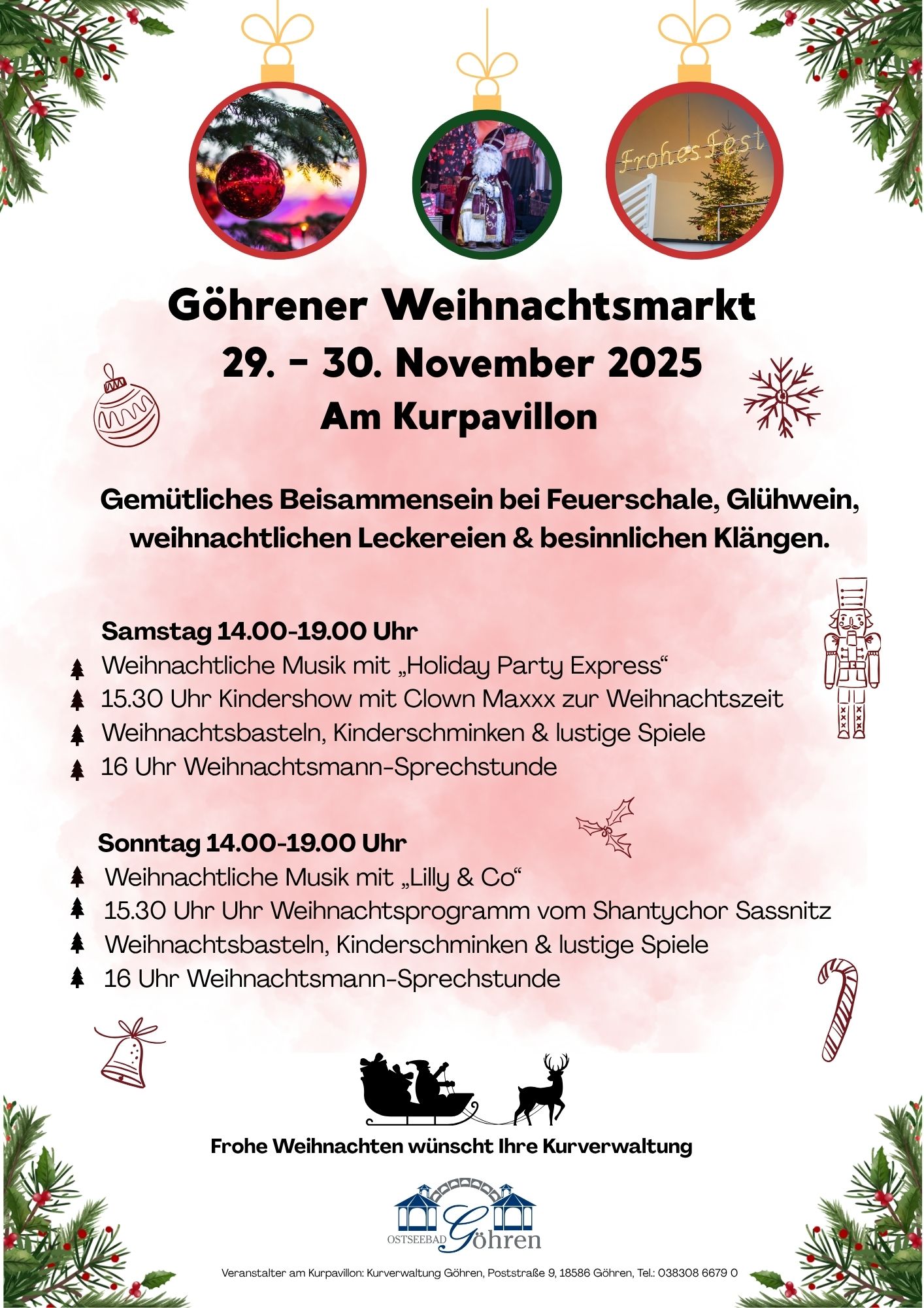 Im letzten Monat des Jahres gibt es im Ostseebad Göhren den traditionellen Mönchguter Weihnachtsmarkt zu erleben und zu entdecken. Besucher sind herzlich eingeladen, das vorweihnachtliche Ambiente in gemütlicher Atmosphäre auf dem Kurplatz zu genießen.